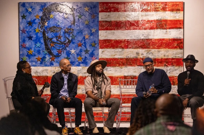 Artists participate in a panel led by Devorah Crable at Pigment International’s “Glory Glory” exhibition at Zhou B Art Center in Bridgeport on Friday. (Arthur Maiorella, For the Sun-Times