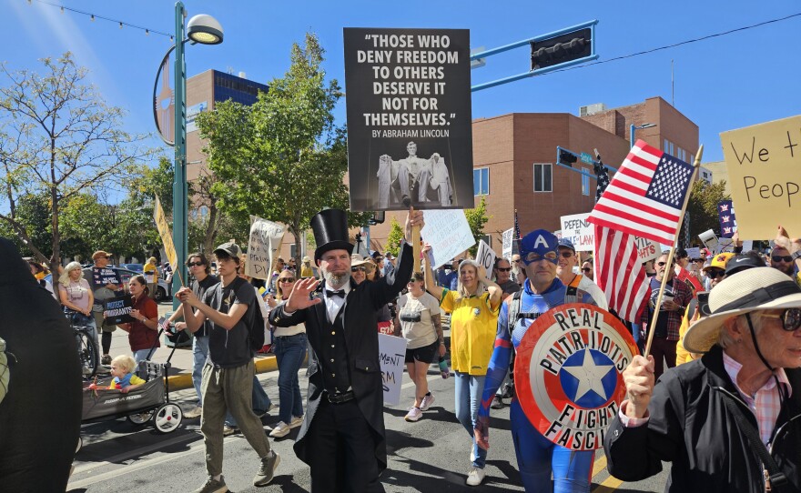 Marchers dressed as Abraham Lincoln and Captain America joined thousands of protestors at the No Kings II rally in Albuquerque (Megan Kamerick)
