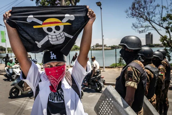 A protester holding a flag bearing the logo of the popular Japanese manga “One Piece” in Antananarivo, Madagascar, last week. (Luis Tato, Getty Images)