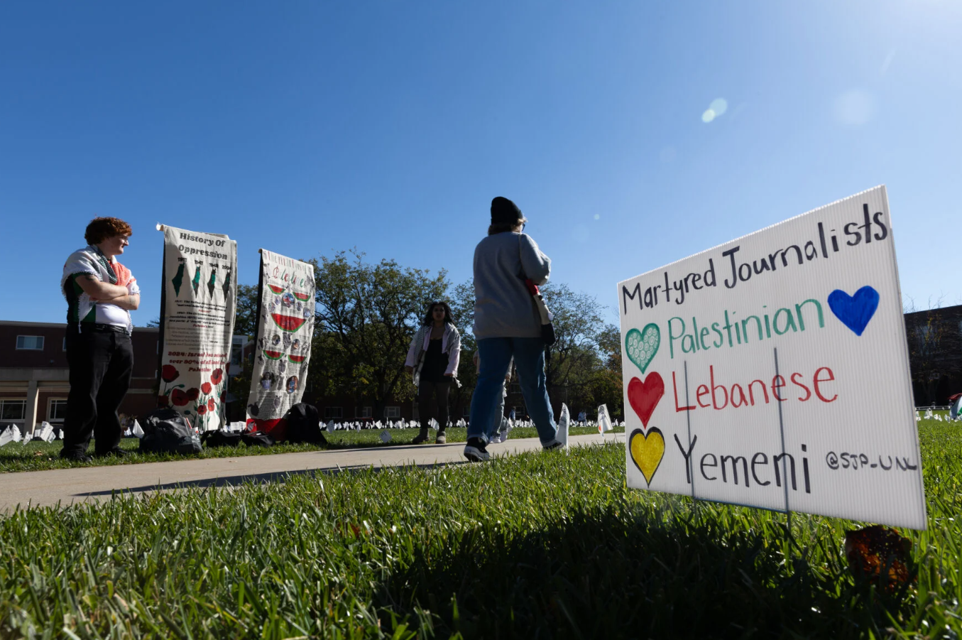 The green space outside the Nebraska Union was covered in white flags Wednesday, each one written with a name of a life lost in Palestine.